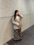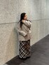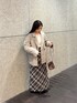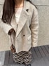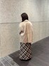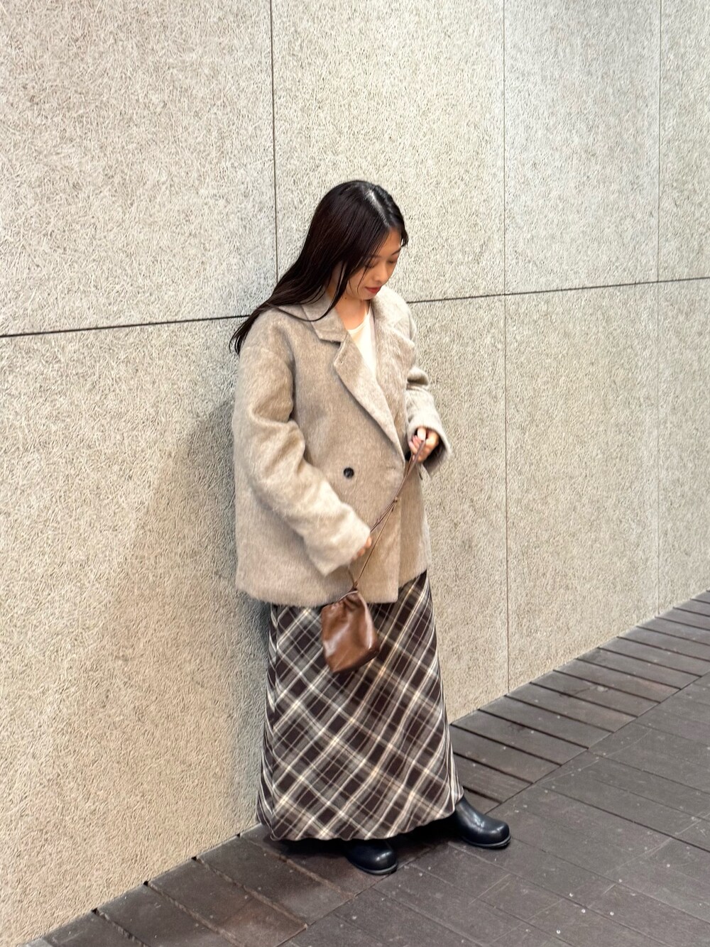 入荷したばかりのシャギーファーテーラードジャケットが主役のコーデ。 インナーに大活躍のシャーリングスリーブベロアトップスを着て、ブラウンのチェックナロースカートを合わせて同系色でまとめました。 小物はポーチバッグをアクセントに、ブーツは黒で締めました。 デートにもおすすめな冬の大人ガーリーコーデです。