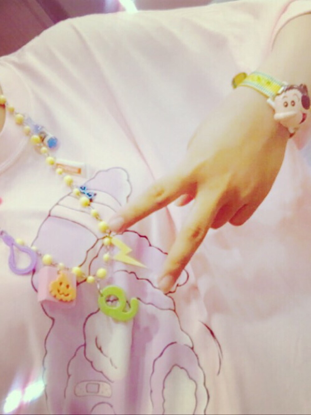 キャンスパのビックTに おもちゃのネックレスとオリーブの時計をブレスレットとしてつけてポップな感じに♬