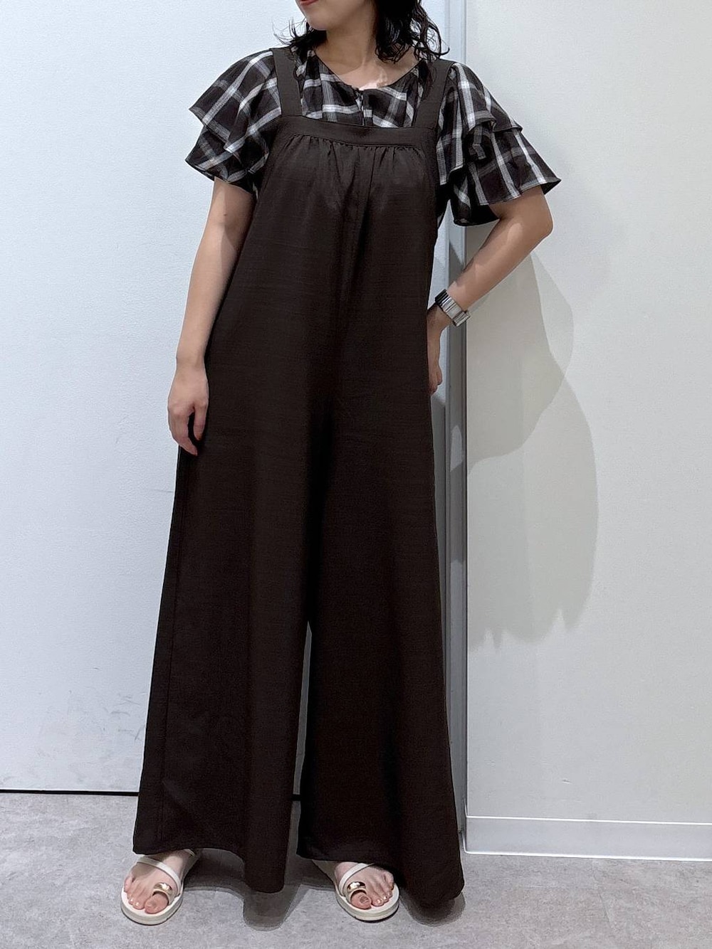 *サロペット* 腰回りがカバー出来るゆったりとした ワイドシルエットで、ストレスフリーな着心地! 胸元のギャザーが可愛いです! 後ろのボタンで着丈の調節が可能✨ *ブラウス* 大きめのチェック柄が可愛い✨️ ラッフルデザインのブラウスです! 大きめフリルですが着膨れしにくいのが嬉しい!