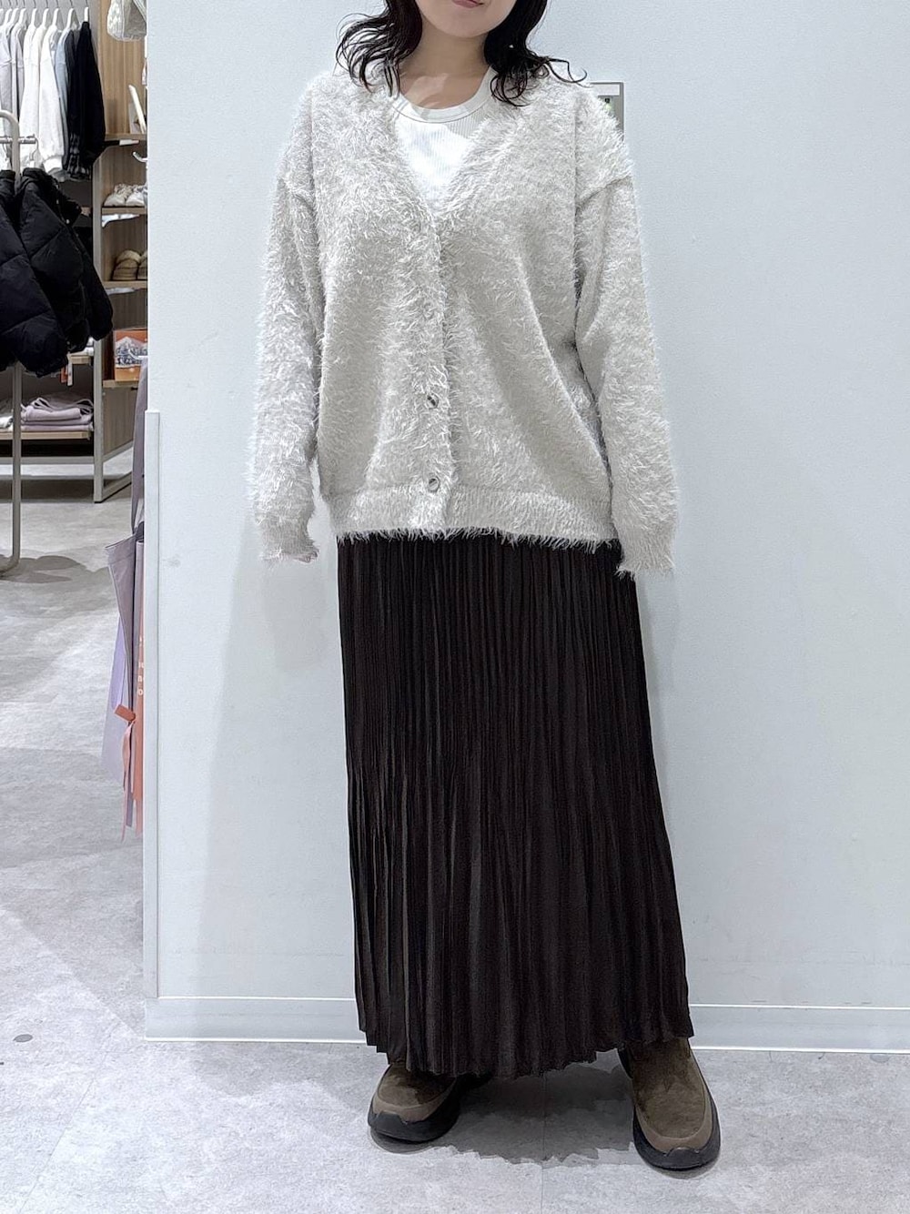 シャギーニットカーディガン×プリーツスカートコーディネート‎🤍