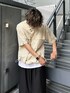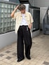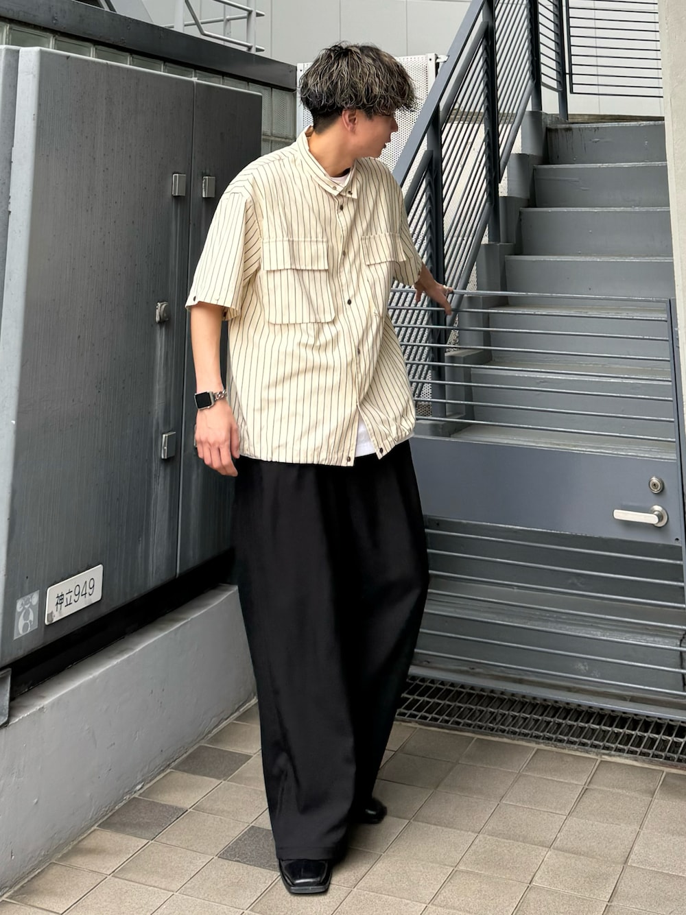 昼間なので袖を取って半袖に、 白Tとレイヤードでこなれ感を💨 逆に足元は、スラックスとブーツでドレス寄りに ワイドめなパンツを選ぶことでキッチリしすぎないスタイリングにしてみました!