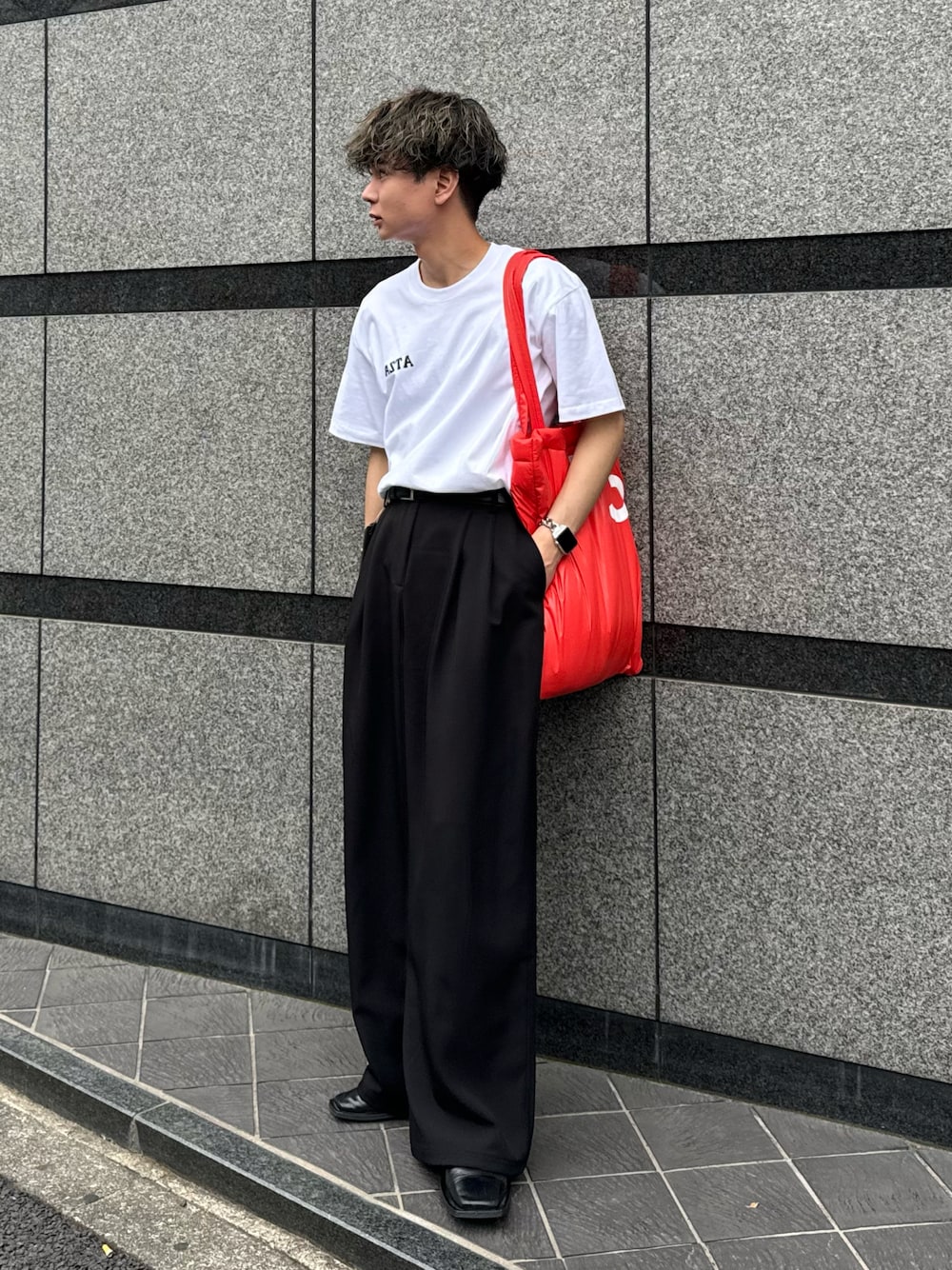 ブラック系のスラックス、ホワイト系のTシャツ/カットソー、オレンジ系のショルダーバッグを着用したメンズの夏コーディネートの1枚目の写真