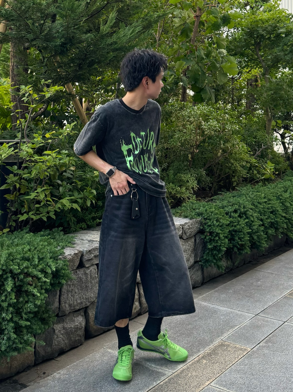 全身黒だけど、ピグメントの要素やデニム生地の要素で素材感の違いを出しました。 差し色もあまり見ない色味にすることでひとクセ垢抜けた印象に。