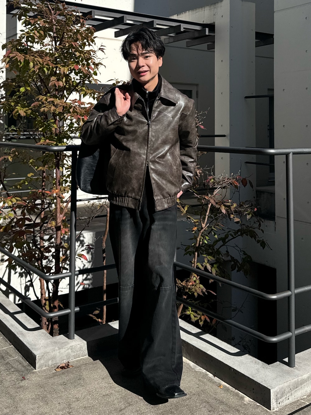 今っぽいシボ感がある合皮アウターとデニムでシンプルにスタイリングしました