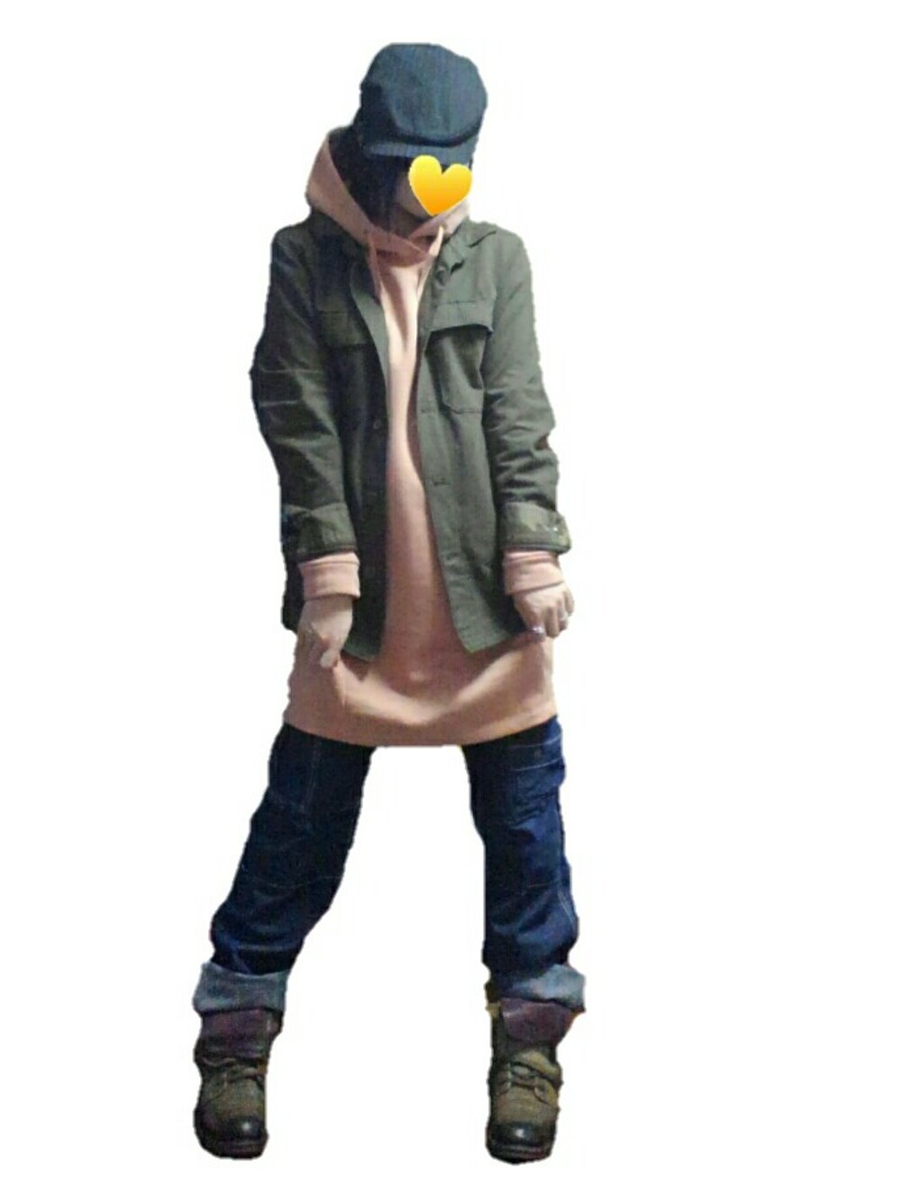 厚着で春っぽいコーデ☺桜餅色コーデ(*^^*) オーバーサイズでボトム太めが気分でした。 シャツの袖口の裏がカモフラ❤ 早く春になってほしいなぁー