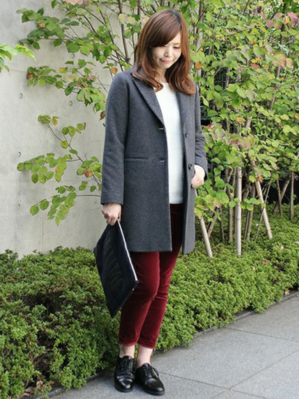 細身でキレイなチェスターコートはボルドーの パンツでポイントに! 縦長な大人スタイリングの完成です!!