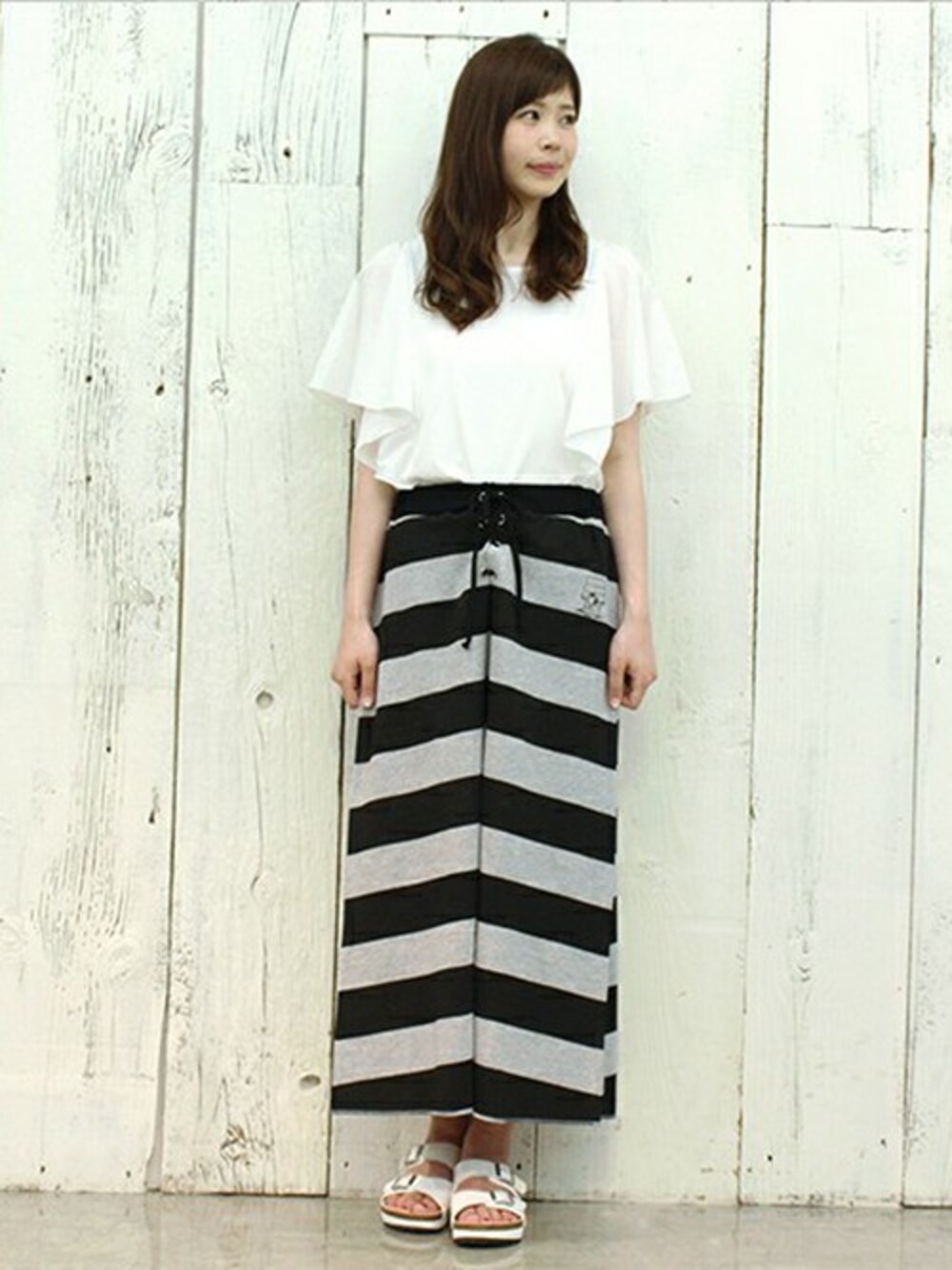 スヌーピーのデザインがかわいいマキシスカートにふわっとしたフレアシルエットがポイントのカットソーを取り入れたスタイリング。 ほどよく甘い印象でお楽しみいただけます