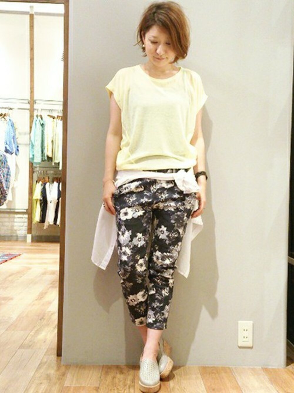 シンプルなカットソーとの組み合わせにフラワープリントの パンツを合わせたスタイリング。 今期注目の総柄アイテムは取り入れるだけで雰囲気の出る かわいいアイテムです!