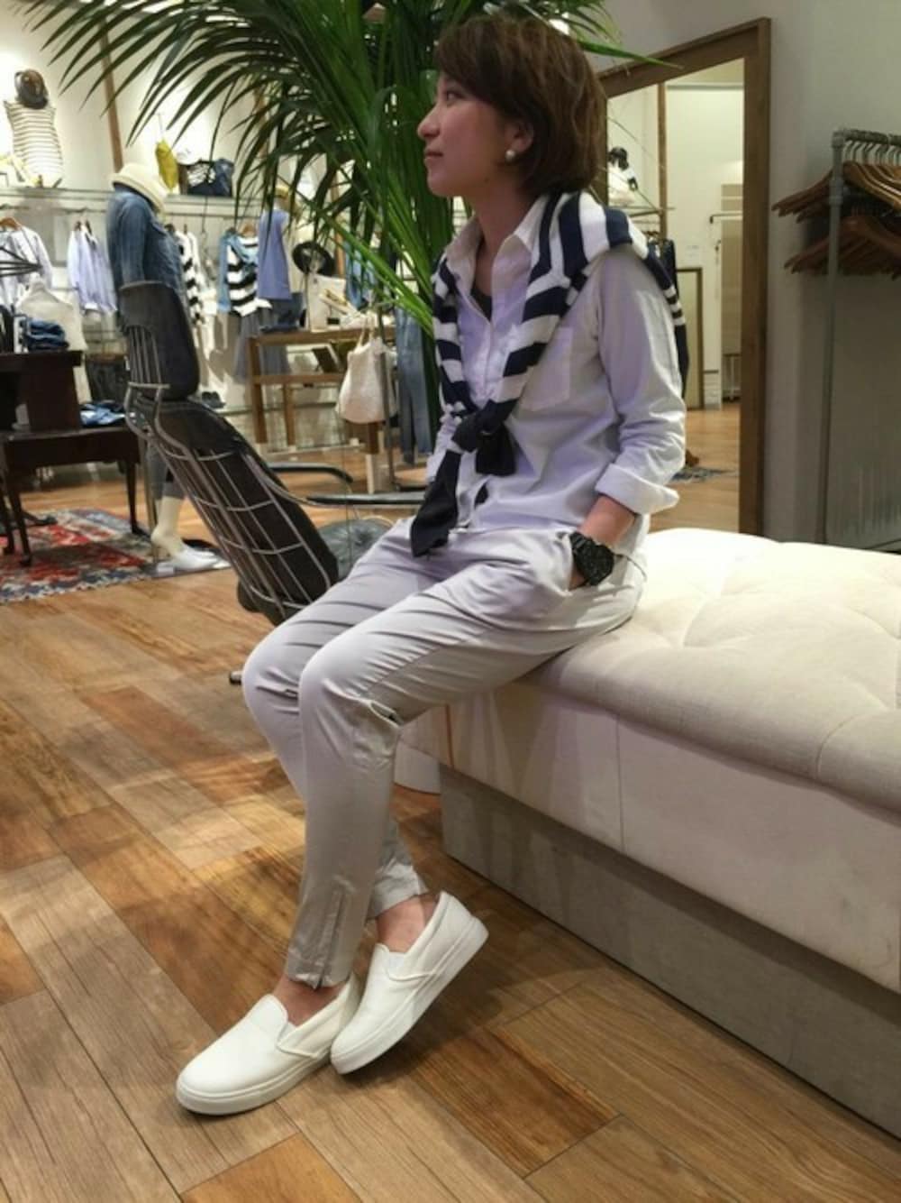 スウェーデン発のブランドoblektのアイテムをメインにスタイリング とくに光沢感と細身のシルエットが非常にきれいなイージーパンツは きれい目スタイリングにおススメの1枚です。