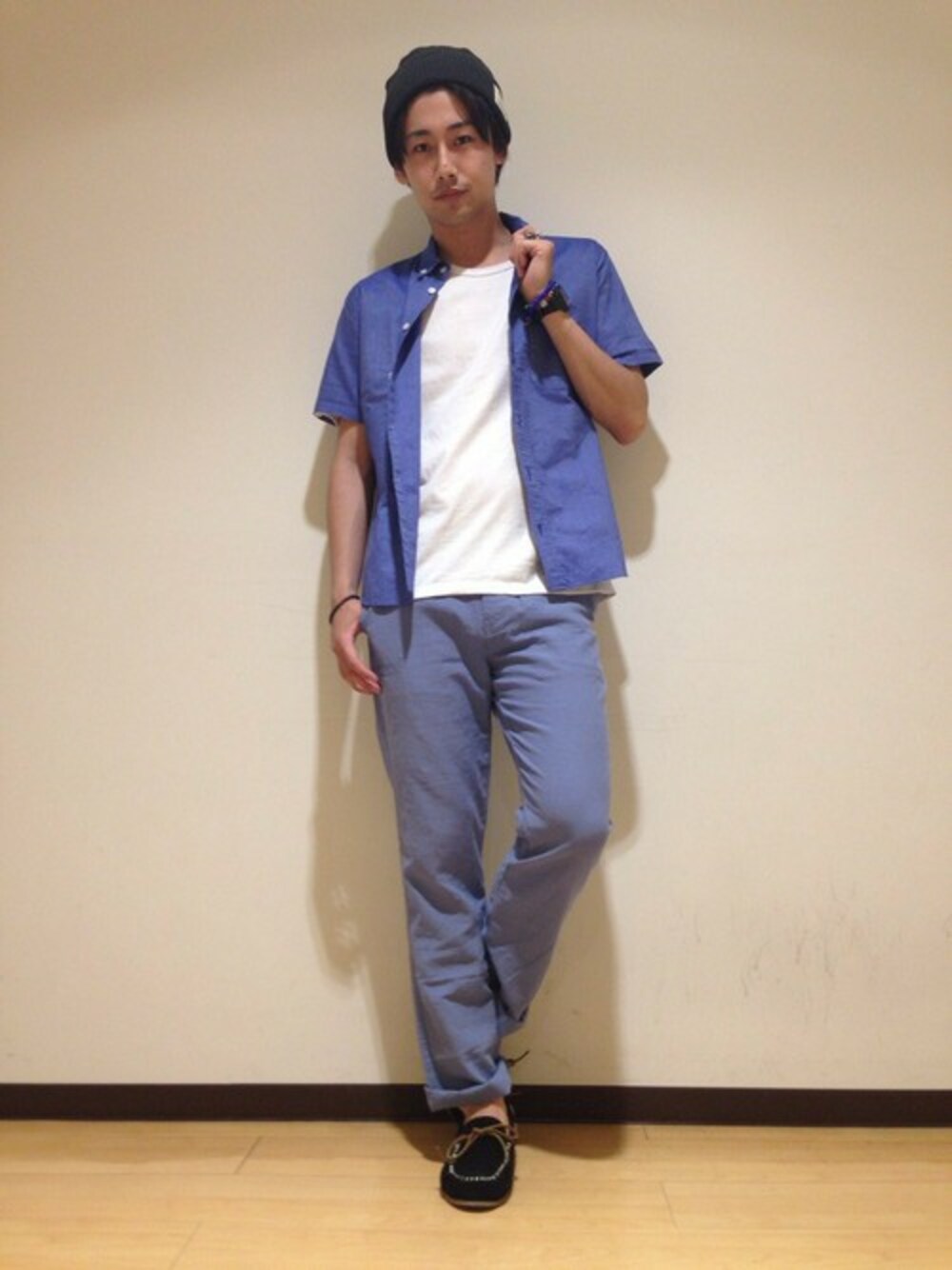 人気のコードイージーパンツ。 難しそうなサックスブルーも同系のシャツで合わせればスッキリとした印象に。