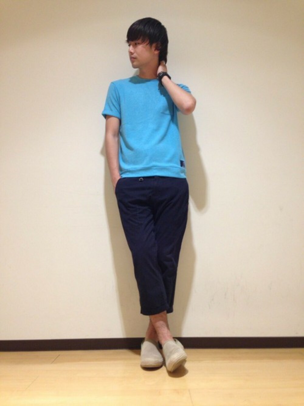 柔らかくて着やすい生地のポケットTeeとクロップドパンツの シンプルな組みあわせを、夏らしいブルーで爽やかに。 無地中心でもスタイリングが映えます。