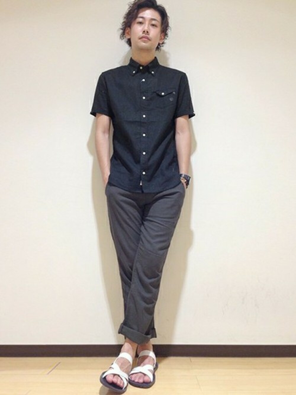 カラーのトーンを落としたスタイリング。 シンプルなので大人っぽく着れるのがポイントです。 子供っぽいイメージの半袖シャツも黒にする事で 上品な印象に。