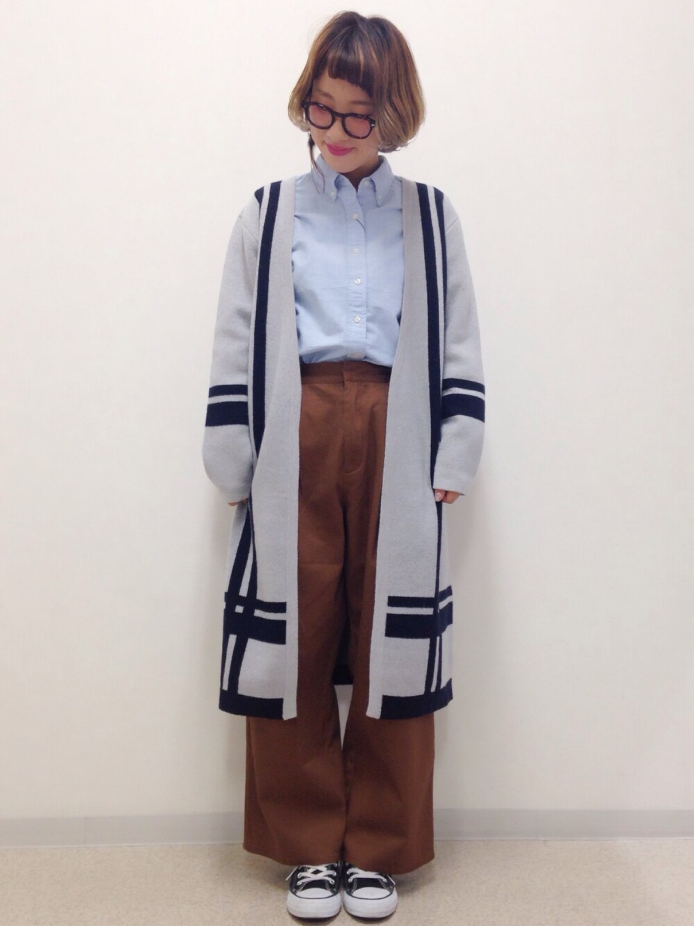 アウター ¥19,000 シャツ ¥5,500 パンツ ¥6,000 (全て税抜き価格) フォークロアな印象のコーディガンは、ワイドパンツで合わせるのがオススメ。 ルーズながらも、シャツできちんと感を出しました。