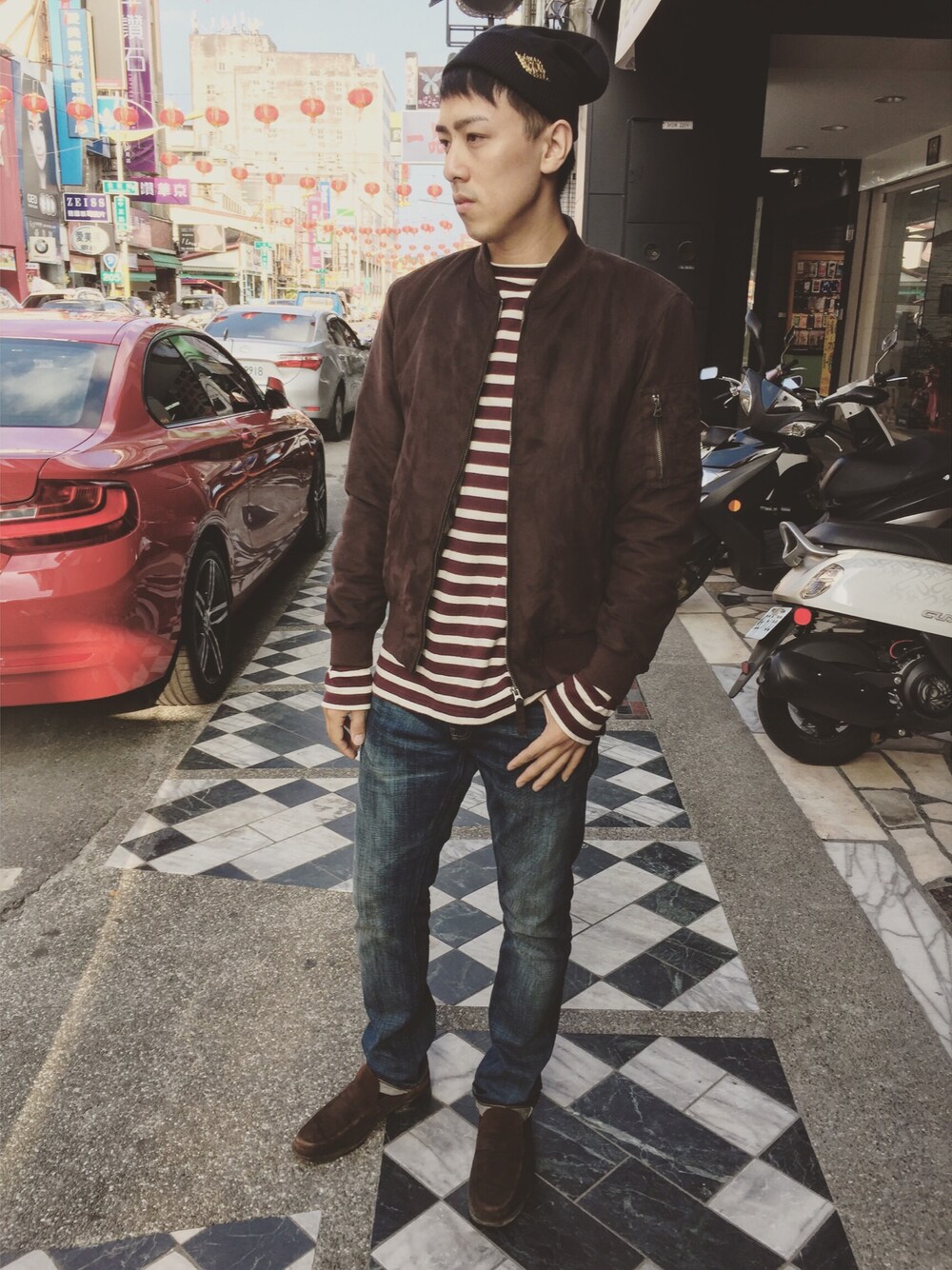 Ready for movie time! Photographer:niu niu Huang 自以為Street snap😋 Hat:Jordan Coat:uniqlo Long sleeves:muji Jeans:Nike sb Shoes:Bally