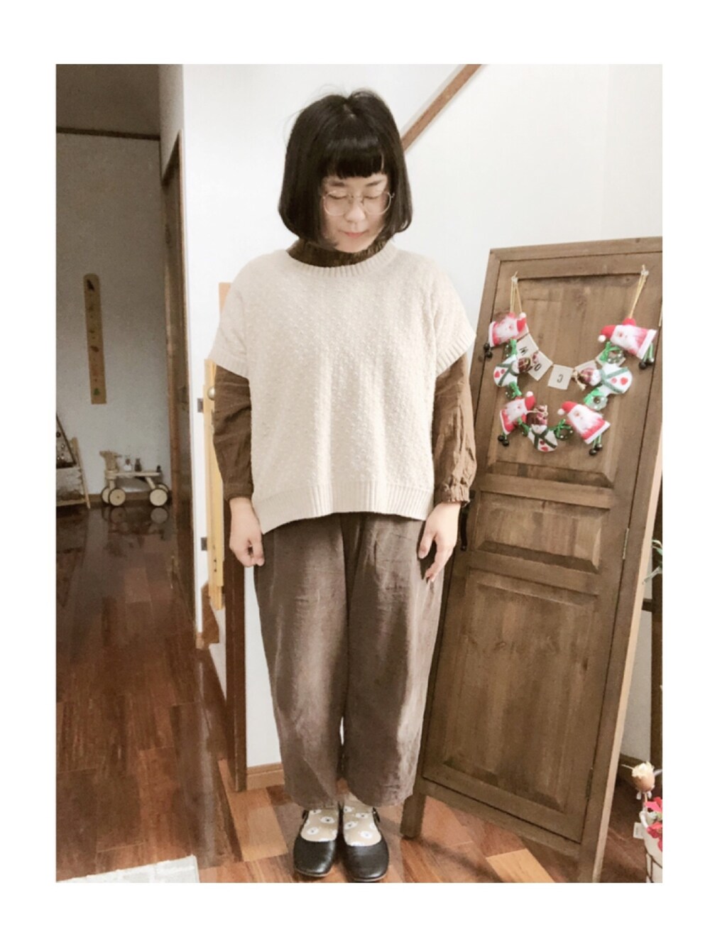 マメӦのニット/セーター「透かし後ろリボンベスト」を使ったコーディネート