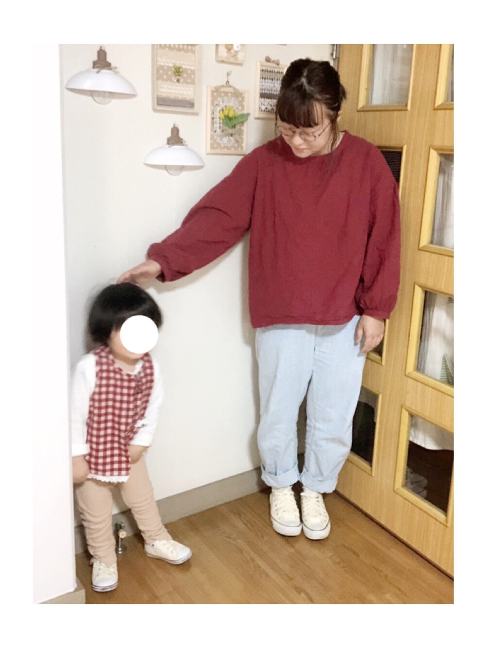 ばぁばお手製のチュニックを着た 娘ちゃんにカラーを合わせてみました! 赤いチェックが可愛いです😍⭐︎ 本人もノリノリで写真に入ってきましたー♡笑