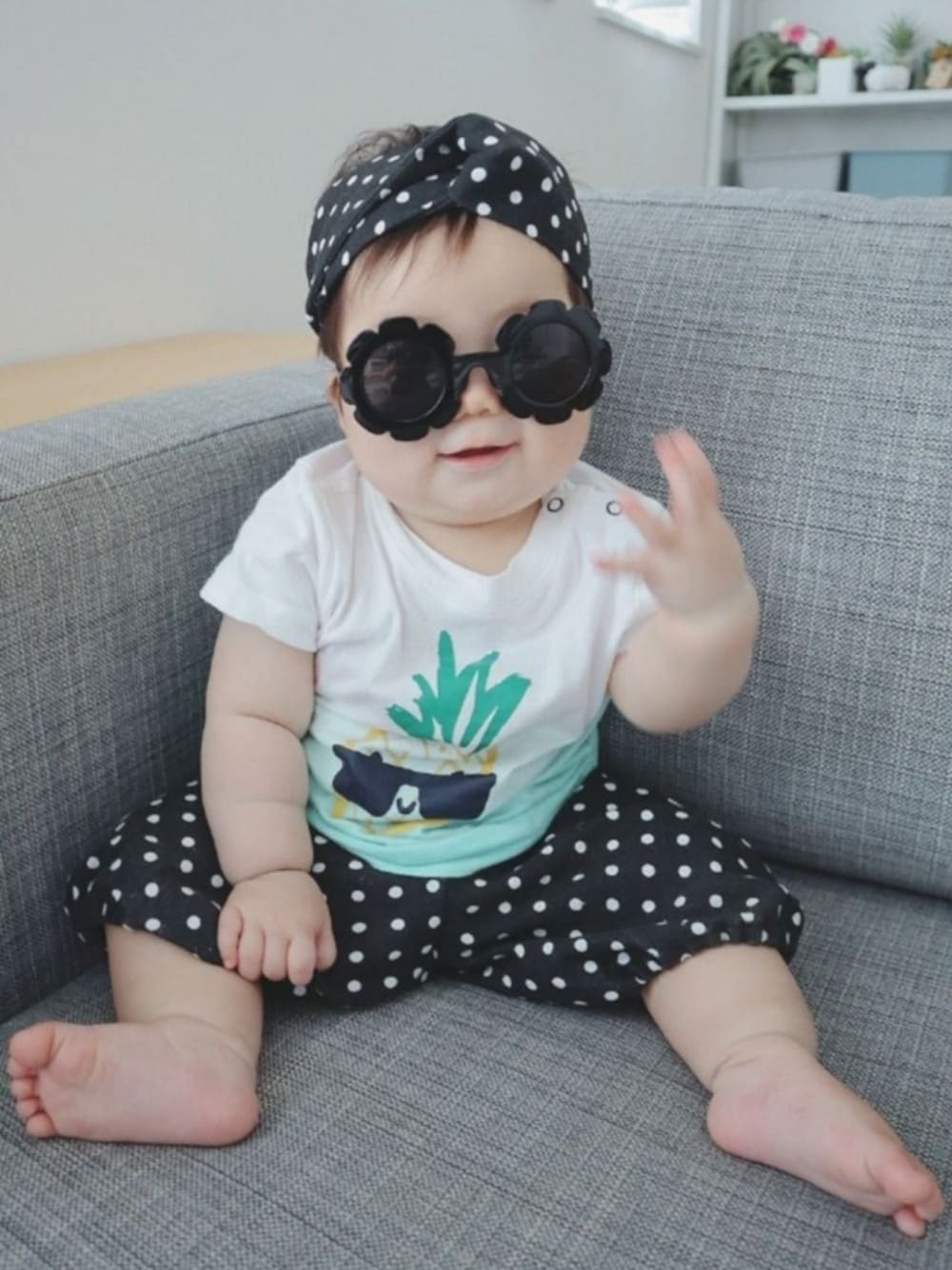 #サングラス 本日はサングラスの日ということで、娘で挑戦✨ サングラスを掴み取ろうとした瞬間を収めた、奇跡の1枚です😂 お花のサングラスはダイソーで購入💠 いつも参考にさせてもらってるpipiさんの真似っこしました♡ Tシャツはお兄ちゃんのお下がり😊 パイナップルもサングラスかけてます🍍🕶️