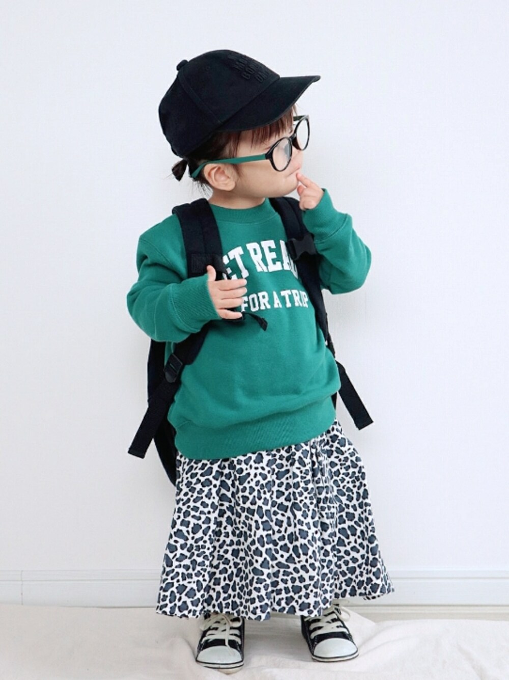 #レオパード 久々に履かせたレオパスカート♡ これかなり丈を長めに作ったので、まだまだ大きいです😂 今回はパキっとグリーンのロゴスウェットと合わせてみました💚 やっぱりモノトーン✕グリーン好きだなぁ🤭🖤💚 子どもたちから風邪をもらいダウン気味です👵💦 今日はコメ欄閉じます💦 ご覧いただきありがとうございました♡