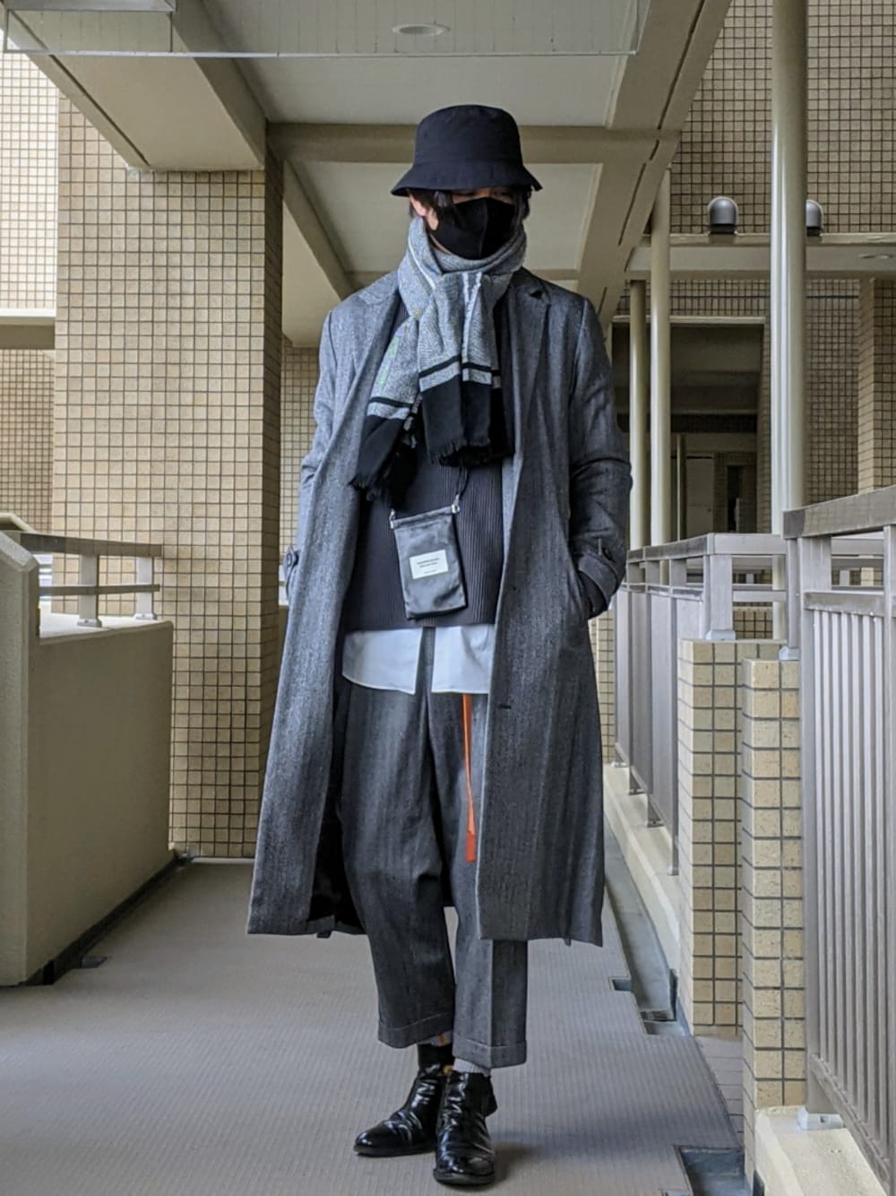 グレーのヘリンボーン柄のコートアップスタイルです。