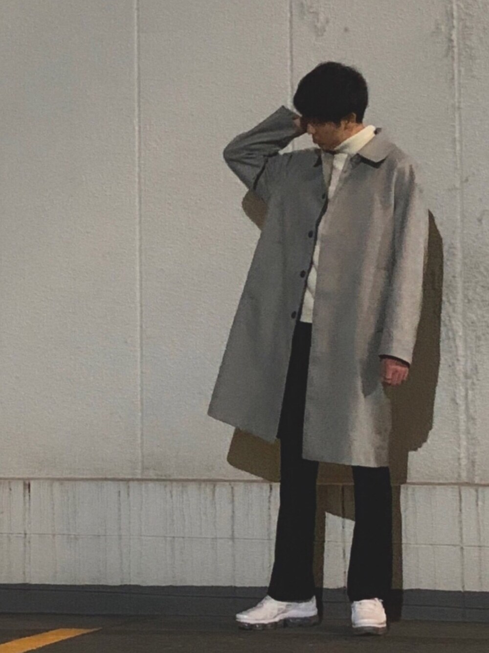 韓国風コーデ! グレーのロングコートに白のタートルニットという、鉄板だけどオシャレな組み合わせ。 グレーや白を基調として、優しい感じを演出してます。パンツにフレアがかかってるのも味噌。