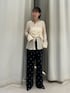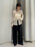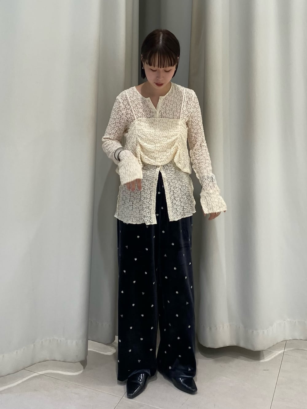 お気に入りのレーストップスです♡ ベロアパンツは生地感がさらっとしており、ウエストもゴムなので、楽ちんに履いていただけます! 私は少しウエスト緩めでしたが、紐を縛ると問題なく履けました! 丈感は160センチでぺたんこ靴で、足首かかるくらいの長さです!