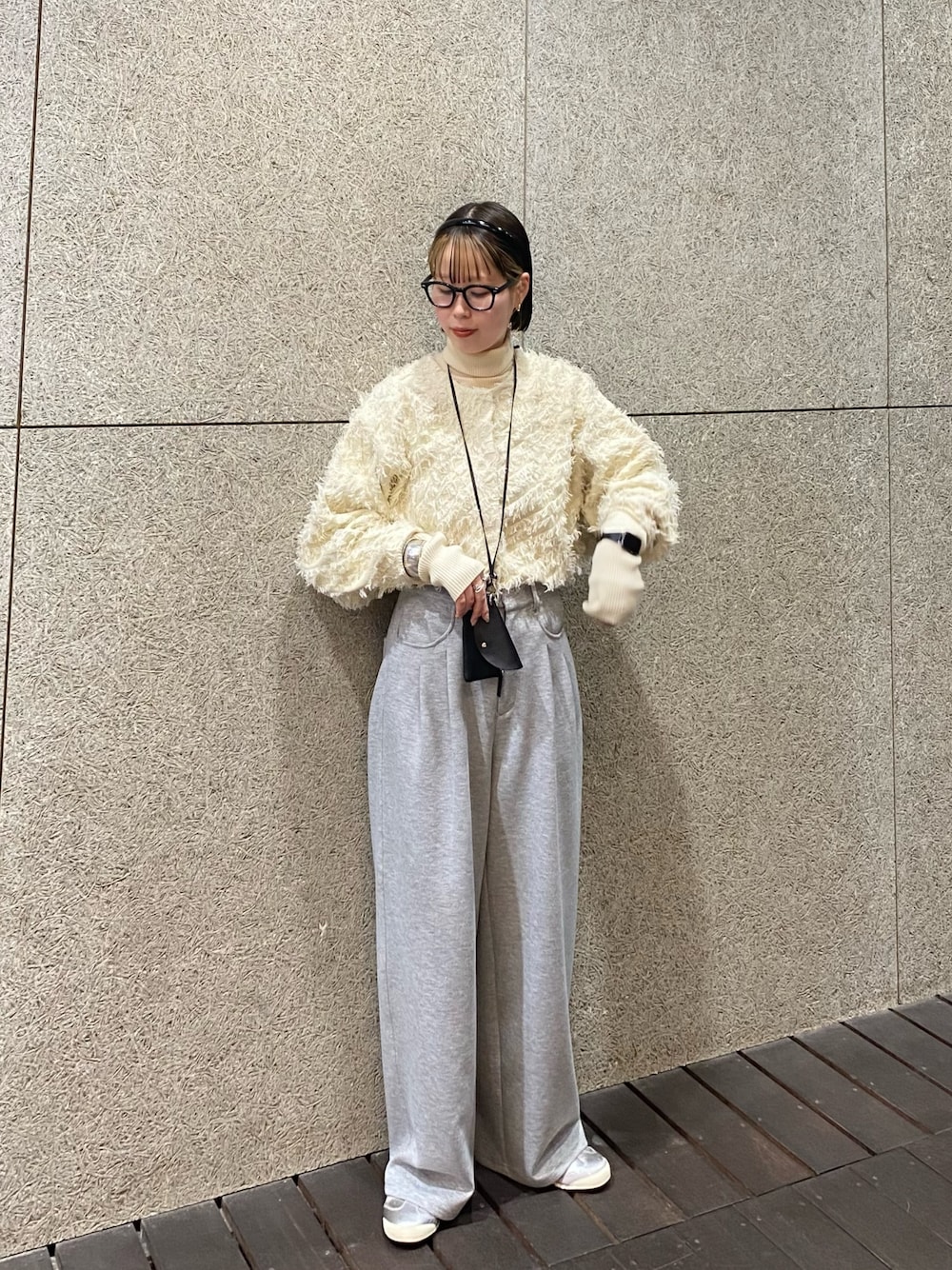 店頭でも大人気のお気に入りのリアルバイコーデです👕✨ スウェットパンツはタックが入っているので、スタイル良くみえるのも嬉しいポイントです◎ カジュアルすぎず綺麗目にも履いていただけます! 160センチで、ぺたんこ靴でパンツを着用すると、丈感少し長めに感じました!高さのあるブーツなどで着用していただくと、より綺麗に着ていただけそうです🙆♀️ フリンジカーディガンはリブ部分が長めなのが 可愛いです🥹♡