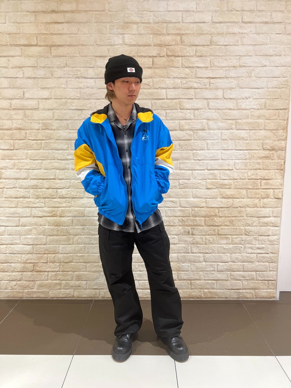 アメカジなチェックシャツにストリート系なゆったりパンツやニットキャップを合わせたコーデ 鮮やかなブルーがより映える着こなしです!