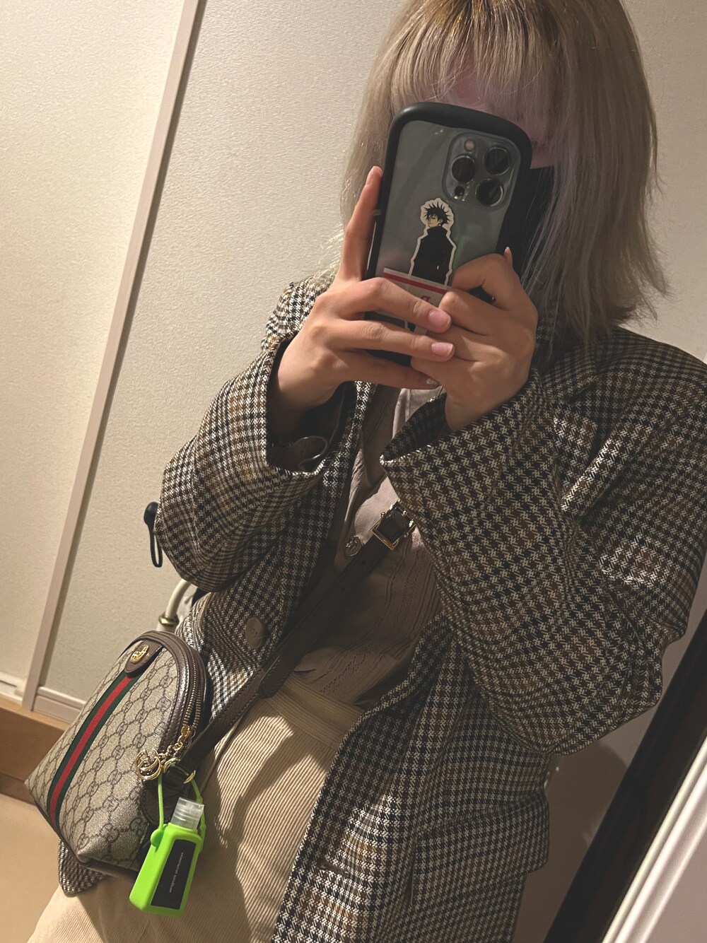 ベージュ系のテーラードジャケットを着用したレディースの秋コーディネートの1枚目の写真
