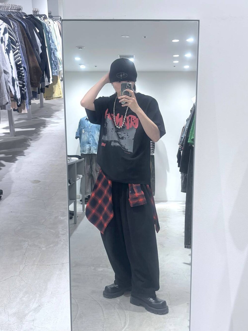 レイヤードに赤のチェックシャツを使った春夏ストリートコーデ