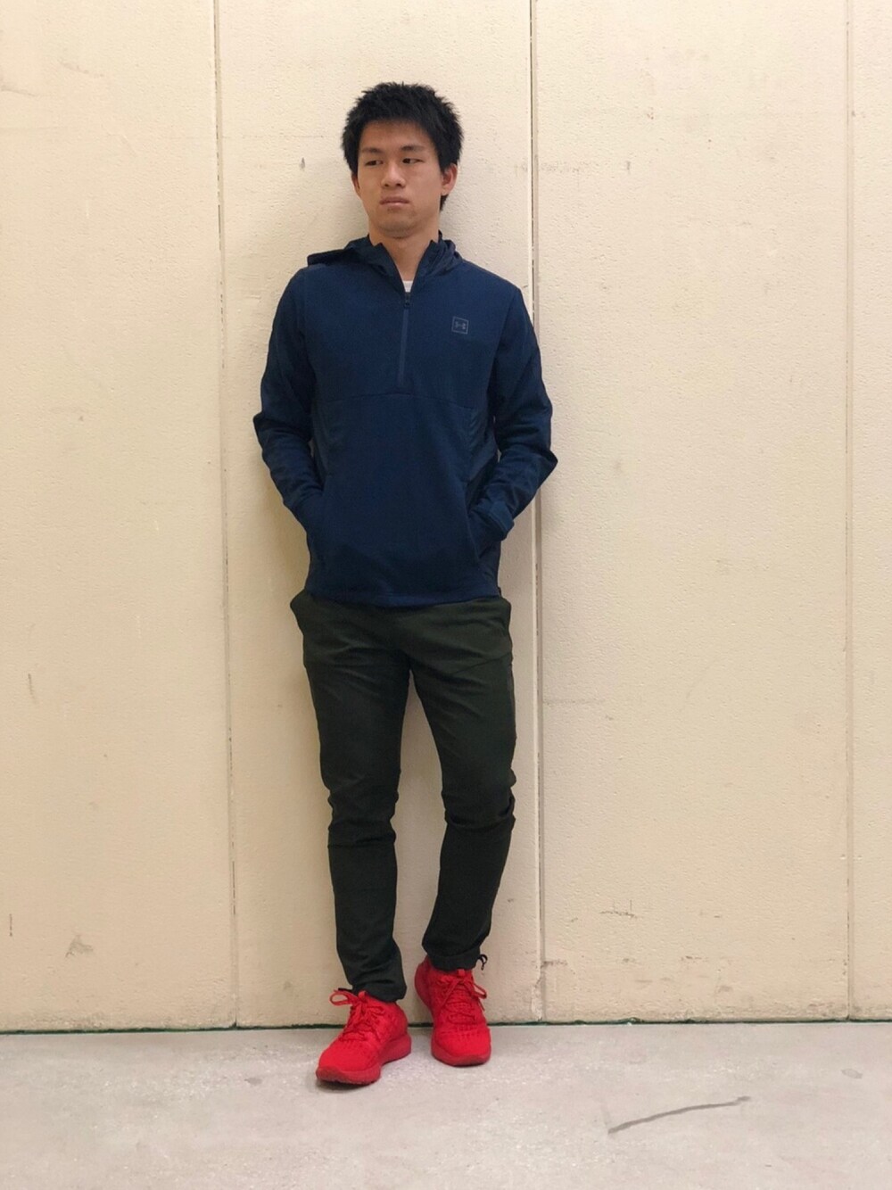 グリーンコーデ⑤ ネイビープルオーバー×グリーンパンツ アパレルは比較的落ち着いた色で靴をポイントにしてみました。