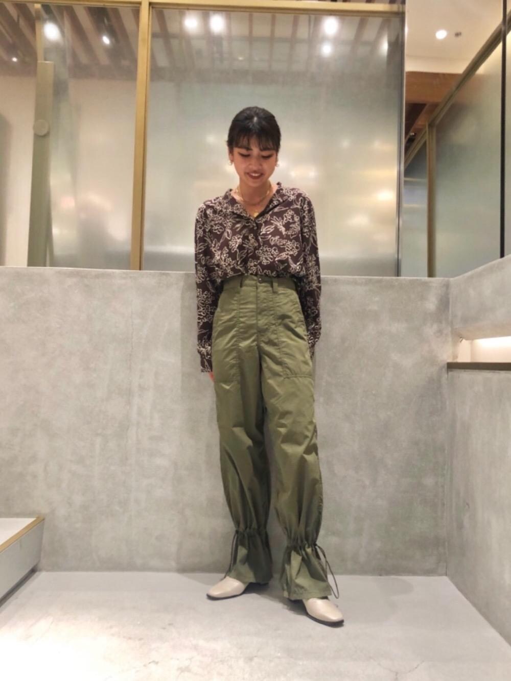 ワーク感の強いパンツにあえてきれい目なブラウスを合わせてみました。カジュアルすぎず、外しになるので上品な印象に。