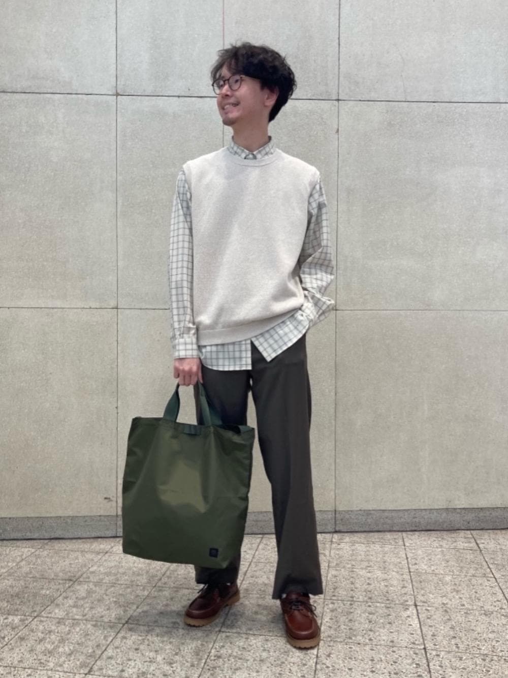 ●年齢 26歳 ●身長 178cm ●普段のサイズ トップス・M ボトムス・M シューズ・26.0~26,5 【サイズ感】 ベスト:標準的 シャツ:身幅ゆったり ボトムス:ウエスト標準的で裾長め シューズ:少し緩め 【素材感】 ベスト:ザラッとしている シャツ:夏場でもベタつかないサラサラな素材 ボトムス:夏場でもベタつかないサラサラな素材 【着心地】 ベスト:緩すぎないので、アウターを羽織っても中でかさばらない。 【コーディネートポイント】 気温調節の難しい季節をイメージしたレイヤードコーデです。 定番なキレイメにしてもいいのですが、鞄でミリタリーテイストを合わせてます。