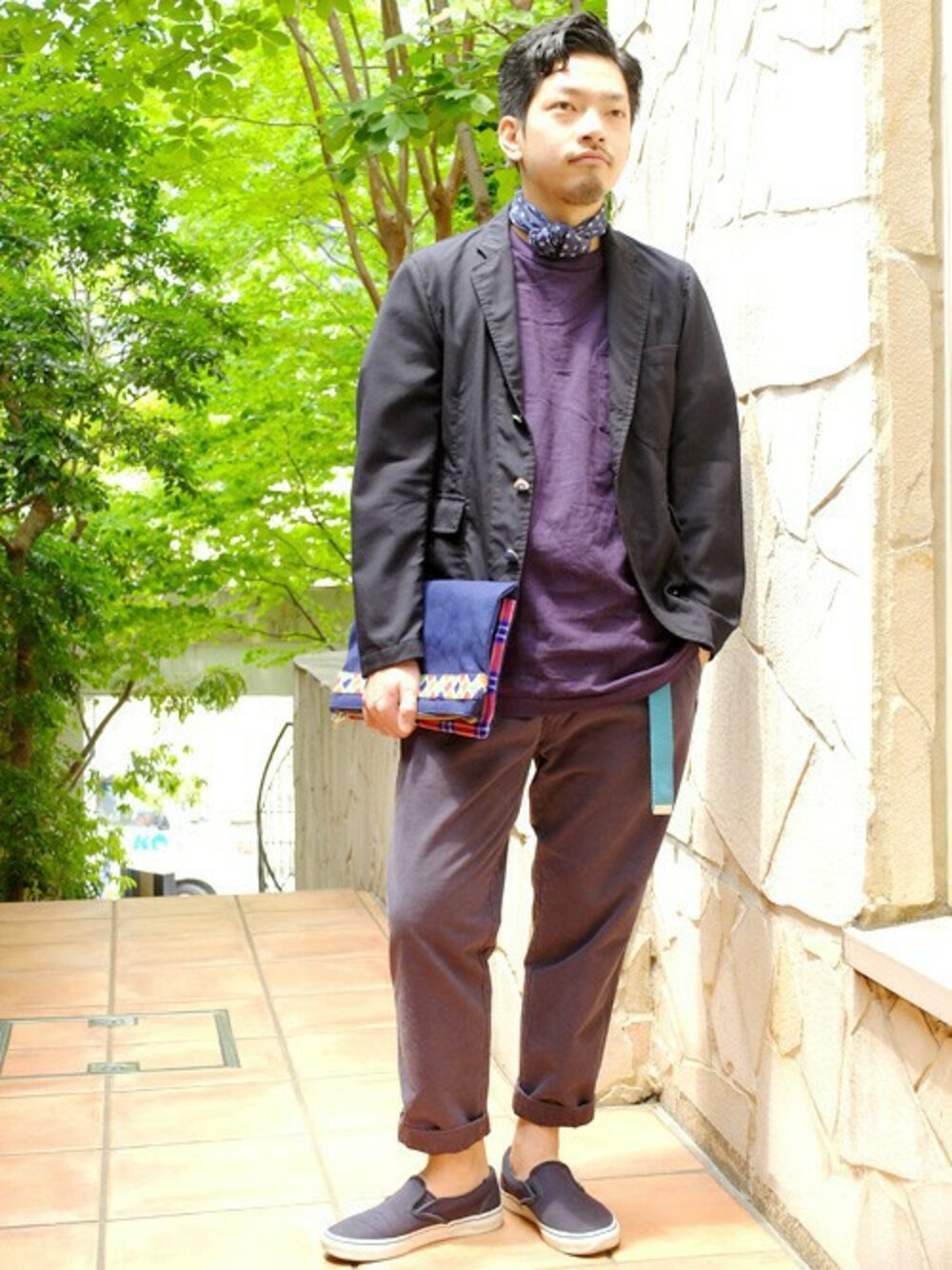 ブルーを基調としたワントーンコーディネートです。昨シーズンもご好評いただいた<CLASS>の別注Tシャツはビッグシルエットが新鮮です。その特長を活かしつつ、ジャケットもアンコンで洗いのかかったものを合わせることでリラックス感のあるカジュアルスタイルにまとめました。