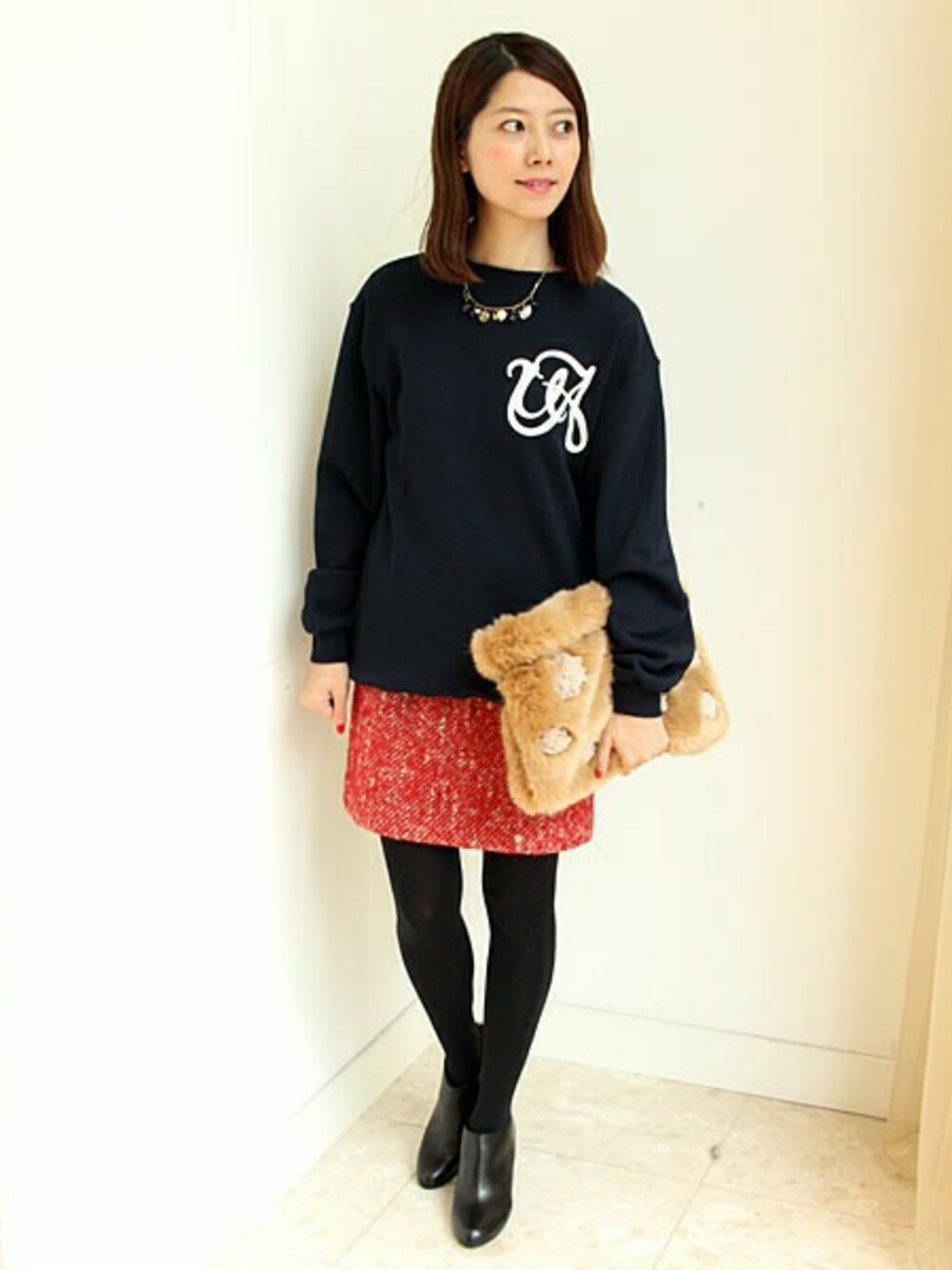 トレンドのオーバーサイズのスウェットをキレイめにコーディネート。カジュアルになりがちなスウェットもミニスカート、ブーティー合わせで女性らしい着こなしに。