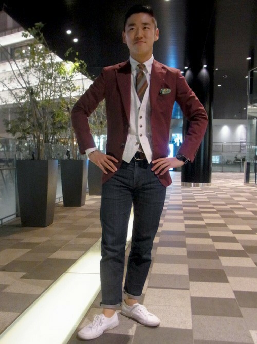 ワインレッドのジャケットを主役にコーディネートしました。気候もすっかり暖かくなり、涼しげな服装が気分になってきましたが、敢えて渋い色合いのカラージャケットをチョイス。重たくなり過ぎないように、中のシャツとベストを白にして軽快な印象に仕上げました。ボトムスにはジーンズを選び、少しカジュアルな印象に。足元をスッキリ見せるために、ハズシとして白のスニーカーで合わせてみました!