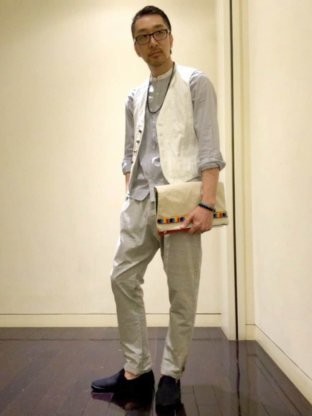 クリーンなバランスを意識したVESTED STYLEです。もともと大好きなスタイリングですが、今シーズンらしくバンドカラーのシャツを組み合わせています。物足りなくならないように、小物でアクセントを加えたのもポイントです。