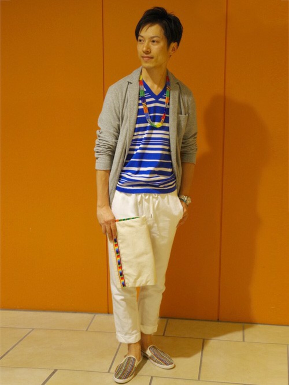 今シーズンおすすめのエスニックテイストを随所に取り入れ、今年は今までと一味違ったリゾートスタイリングを演出。夏になると、カラフルなアイテムが着てみたくなる今日この頃。メインのジャケット、パンツは落ち着いたグレー、ホワイトで控えめにしつつ、清涼感のあるコバルトブルーのTシャツをポイントに、ネックレス、バッグ、シューズのエスニックでカラフルな色使いが、全体を明るく引き立たせてくれます。インナーや小物でカラフルなアイテムを取り入れてみてはいかがでしょうか?この夏おすすめです!!