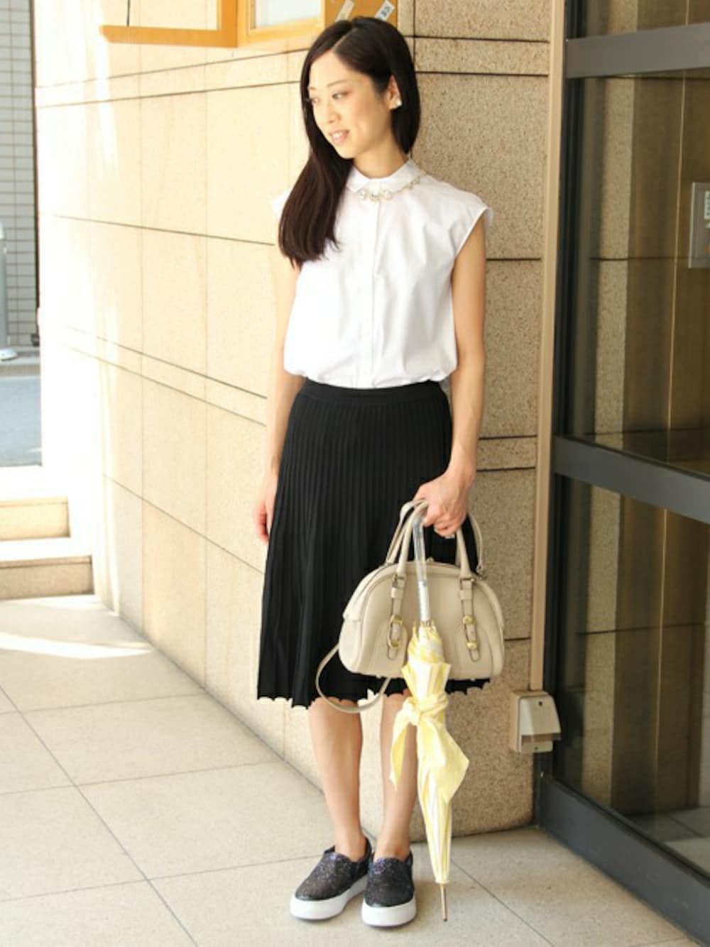 シャツに膝丈のプリーツスカートでカチッとなりがちなスタイリングにあえてスニーカーを合わせて ドレスダウン。 大人のデイリースタイルに是非取り入れて頂きたいスタイリングです!