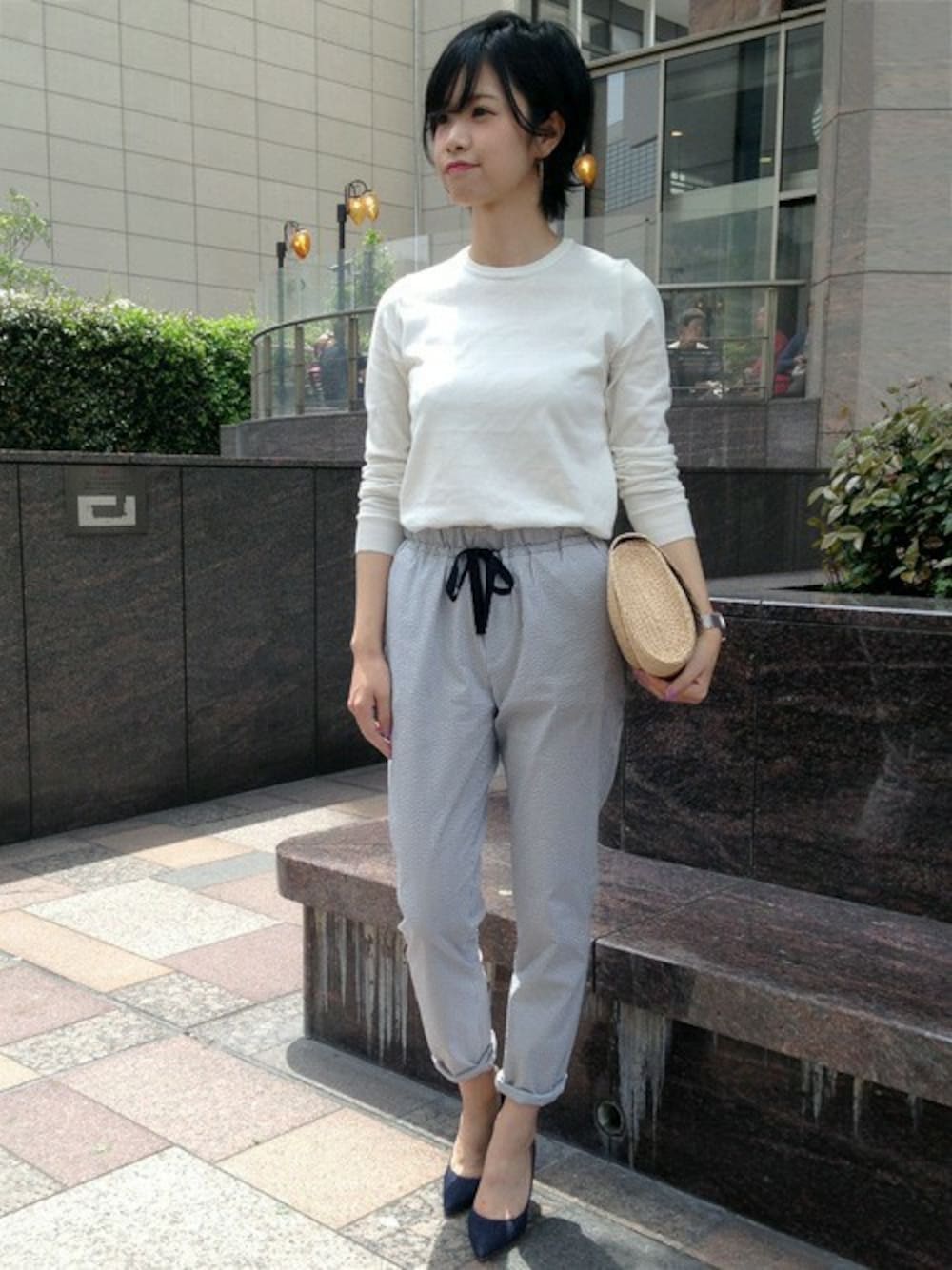 シアサッカーのパンツを主役にリラックス感のあるコーディネート。 ハイトーンで合わせてクリーンな印象に。 クラッチバッグと、足元は大人っぽくポインテッドトゥのパンプスで合わせ、小物使いで引き締めました。