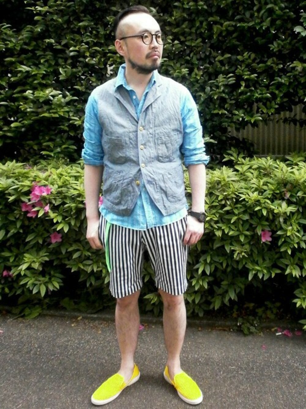 ショーツが穿ける季節がやってきました。トップスが半袖だと肌寒い日もあるので、大好きなインディゴ染めの長袖シャツに、洗いざらしでも着られるベストを合わせました。主役のショーツは太めのストライプで一見アクセントが強いですが、膝上の長さで見える面積が少ないためスッキリした印象でチャレンジしやすいです。さらにアイキャッチとして、挿し色に明るいグリーンのベルト、黄色のスリッポンを合わせ、一足早い夏を色で表現しました。
