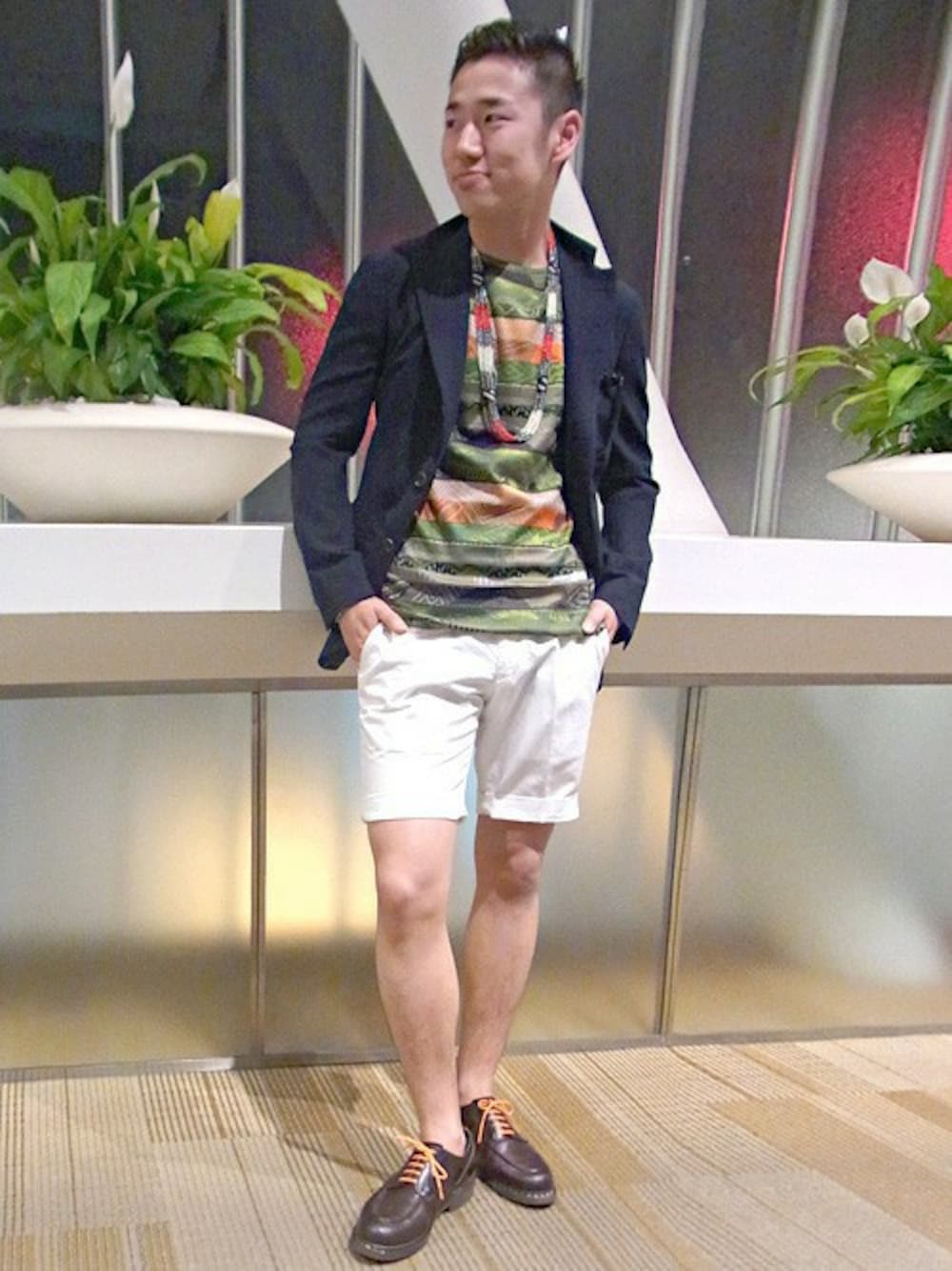 存在感のあるカットソーをインナーに、夏らしく白ショーツで合わせてみました。夏場には最適なサッカーのネイビージャケットを羽織って、ラフすぎない印象に仕上げることで、どこへでも出掛けられる雰囲気になりました!サングラスやネックレスなどでアクセントを効かせたり、スタイルに合わせてシューズの紐なども替えてみたりして、夏のオシャレを楽しんでみてはいかがでしょうか?