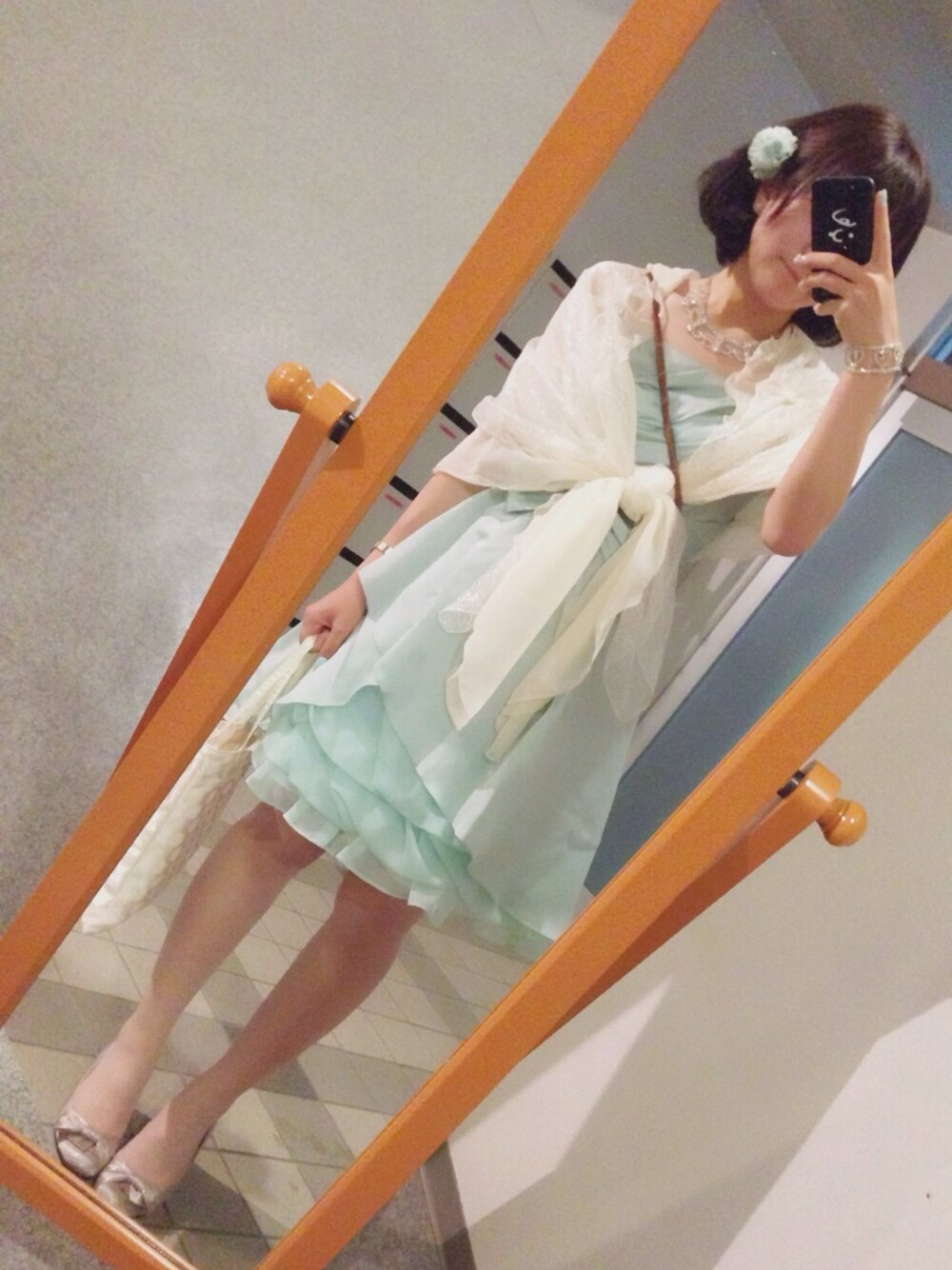 友人の結婚パーティーへ。 大好きなミントグリーンで固めたよ ショルダーポーチは母の友人からのお下がりなんだけれど、お気に入り。