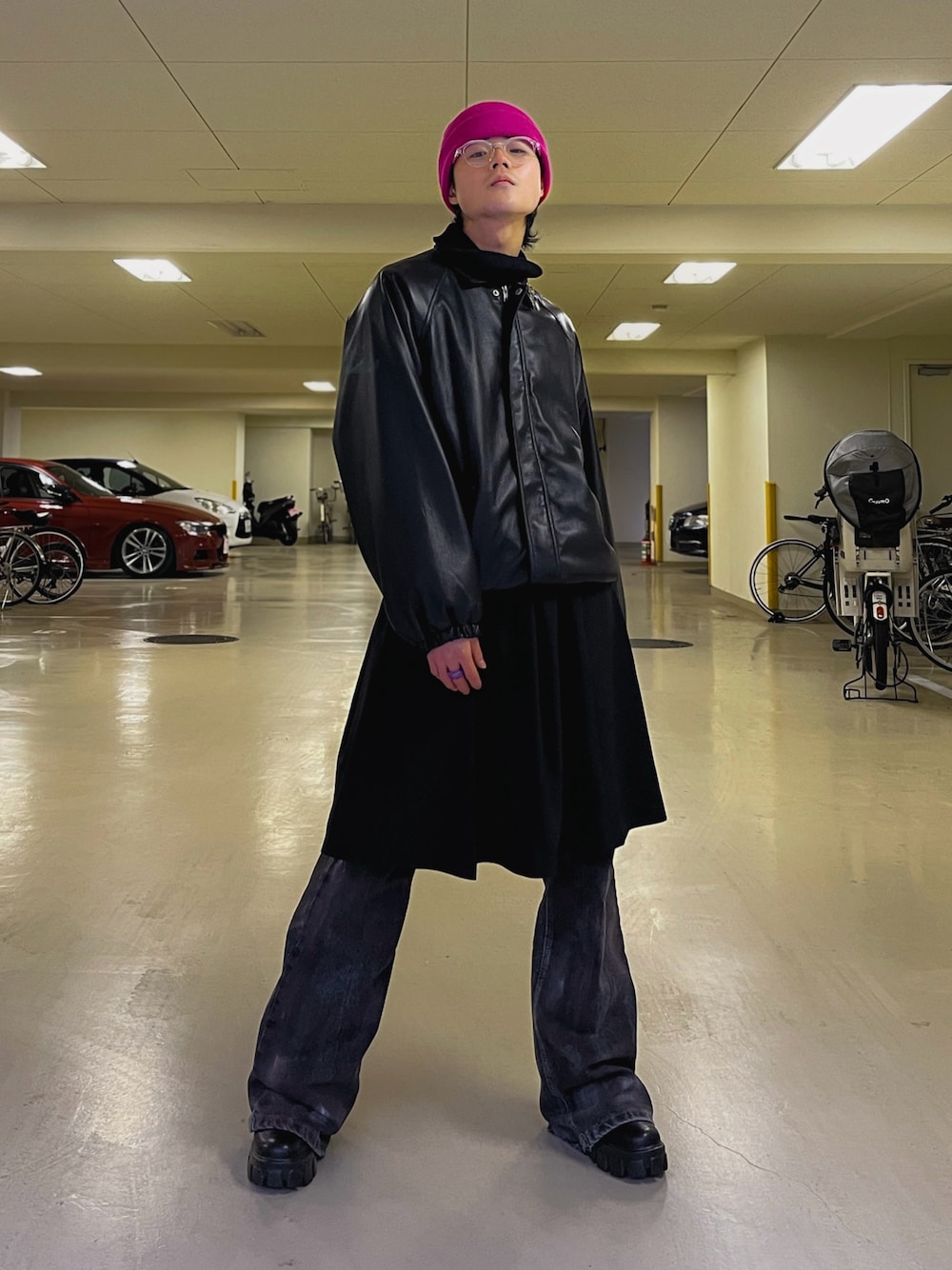 春はレザーで決めきりましょう!🤪✨ 差し色のピンクでオールブラックにバチっとカラーを入れつつモードな雰囲気に。 全体が黒だと重い印象になるので 最近流行りのリムレスメガネや、 この写真のようなクリアレンズを入れてあげると、抜け感が足される気がします!