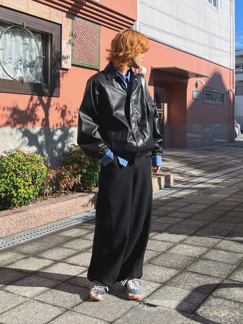 ゆーぼうのブルゾン「オーバーサイズフェイクレザージャケット」を使ったコーディネート