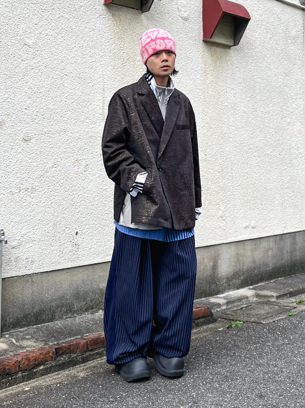 オーバーサイズの光沢感あるジャケットを主役に、レイヤードで個性を際立たせたコーデです。 ジャケットのラフなシルエットがトレンド感を引き出しつつ、落ち着いたブラウンカラーで上品さもプラス。 トップス: ジャケットの下にシャツとトラックジャケットを重ねたミックスレイヤードが新鮮。 袖から見えるストライプ柄が遊び心を演出。 ボトムス: ネイビーのワイドパンツが動きを感じさせ、全体にモード感をプラス。 小物: ピンクのニット帽がコーデにポップなアクセントを加え、バランスを調整。 カジュアルとエレガンスを融合させた、気負わないけれど存在感のあるスタイル。ぜひ取り入れてみてください!