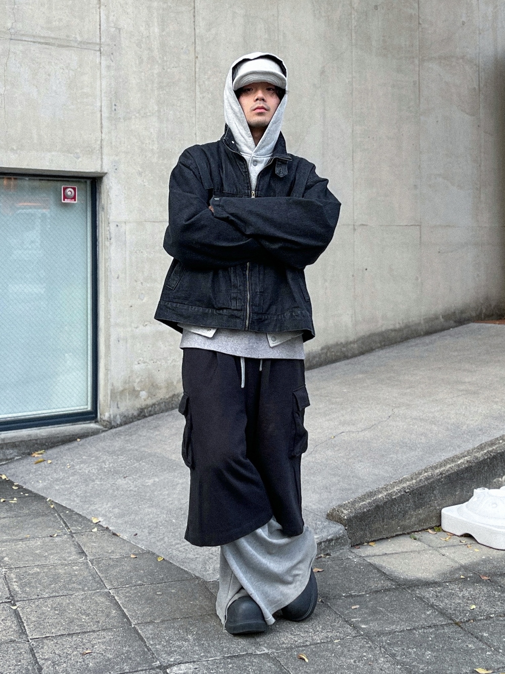 ブラックのデニムジャケットを主役に、レイヤードでボリューム感と遊び心をプラスしたストリート感あふれるコーデです! 全体をモノトーンでまとめながらも、異素材の組み合わせで奥行きを演出しています←これ大事! トップス: デニムジャケットの下にグレーのスウェットフーディをレイヤード。カジュアルさと防寒性を両立❄️⛄️ ボトムス: ブラックのカーゴショートパンツとグレーのスウェットパンツを重ね、リラックス感と立体感を演出👍⚡️ レイヤードとシルエットを活かした、動きやすく真似しやすいスタイル。ぜひストリートコーデの参考にしてみてください!