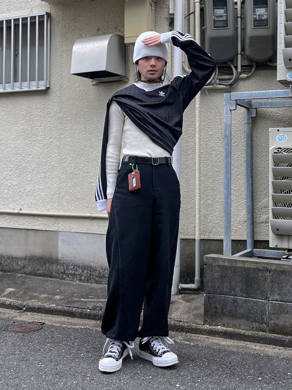 トップスとして着るのではなく、ロンTをあえて片袖だけ通して肩掛け風にレイヤード。 インナーはリブニットでスッキリ見せ、下半身はストレートなパンツとコンバースでストリート寄せに。 ● 形状・シルエット • ロンTの「片袖掛け」でアシンメトリーな立体感 • インナーはコンパクト、パンツは程よいワイドでバランス調整 • 足元は定番のローテクスニーカーで落ち着かせてる ● 色合わせ • モノトーン(白黒)でまとめてシルエットを際立たせる • キャップのホワイトとトップスの白をリンクさせて統一感
