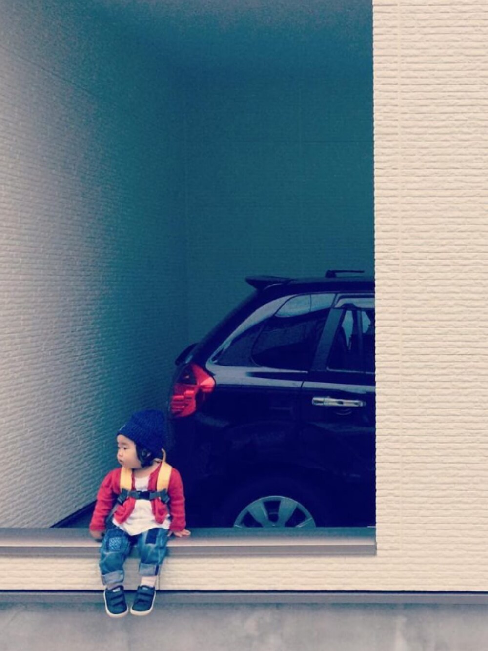 スタンスミスのスニーカーとニット帽は本人希望により着用。 赤いカーディガンは昨年来てたのを着せてみたらお腹が出ちゃったので今日でおしまいかな…。