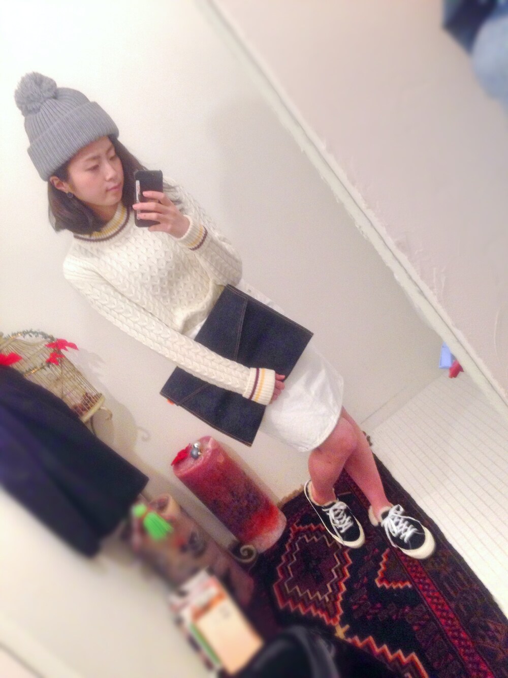 ニット帽、ボアスニーカー : holiday ニット : pheeny スカート、クラッチバック : SEA