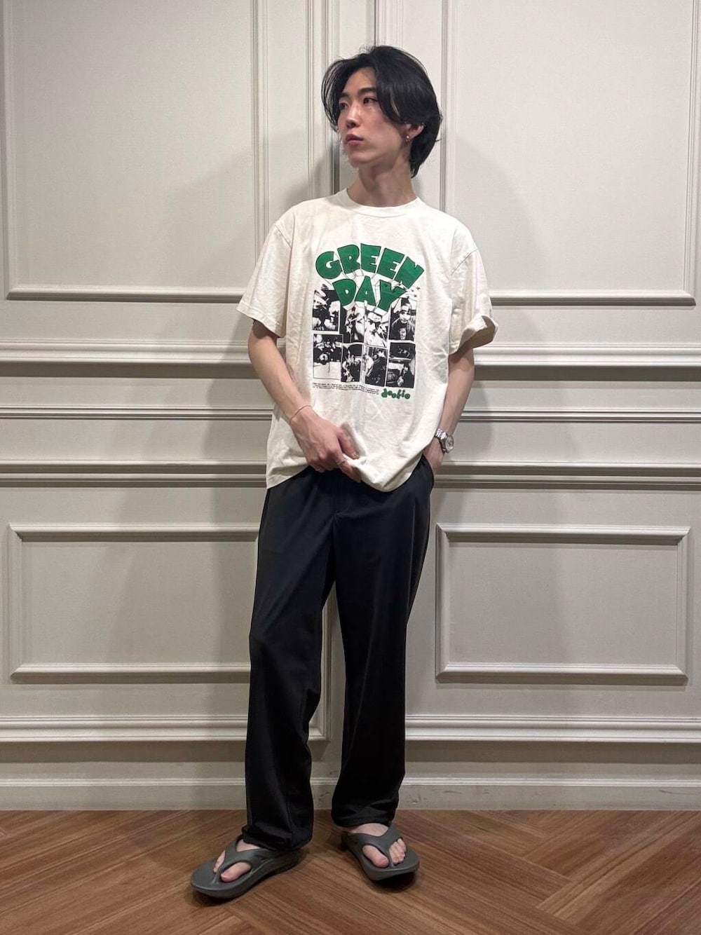 GREEN DAYのTシャツを着用してみました💚🎸 モノトーンながら存在感のあるプリントに グリーンの文字が映える一着!!👀✨ 今の時期は一枚でサラッと着れて もう少ししたらジャケットのインナーに使いたいです🙌 真っ白すぎないアイボリーカラーが合わせやすいです☘️🤍